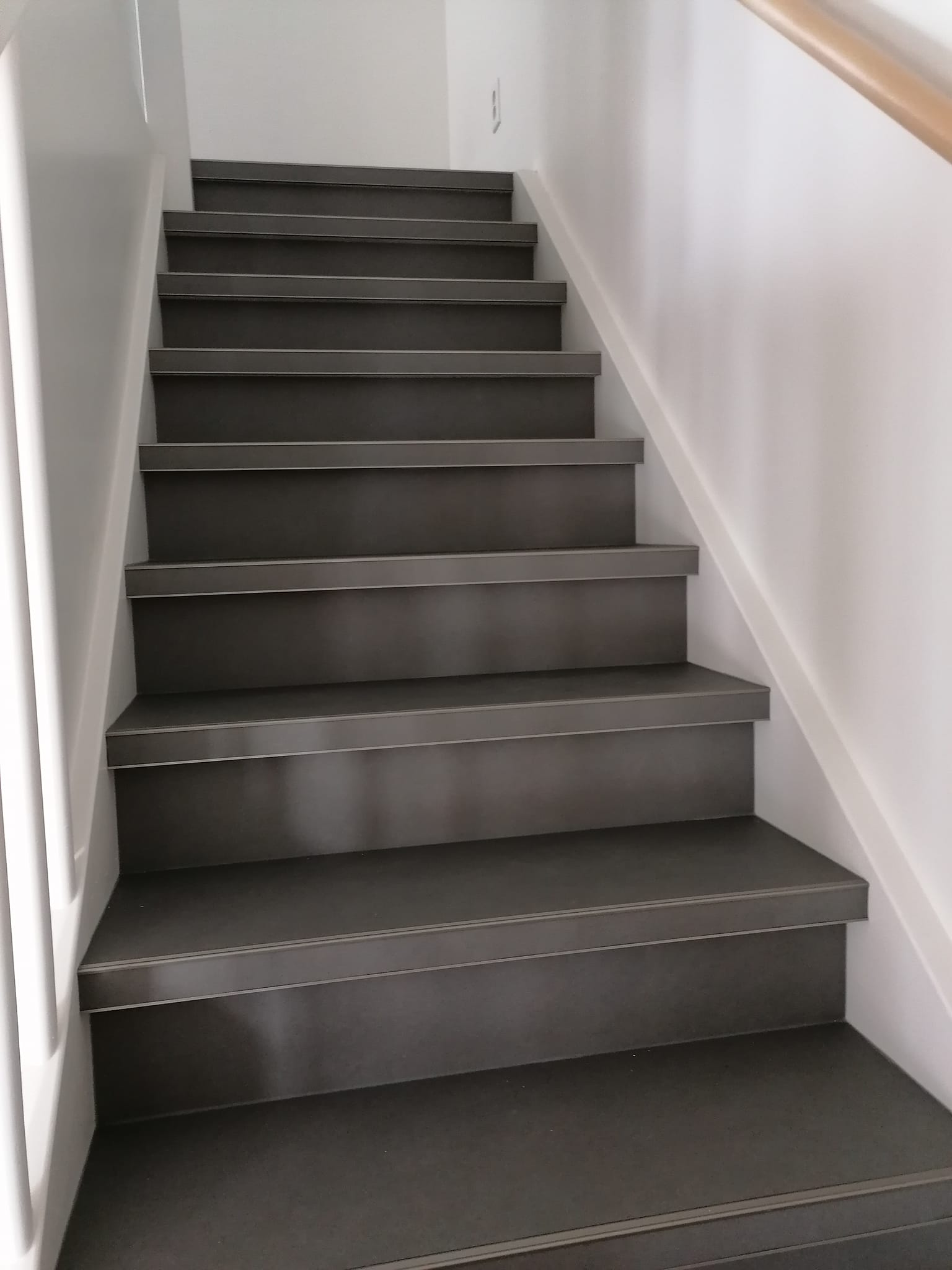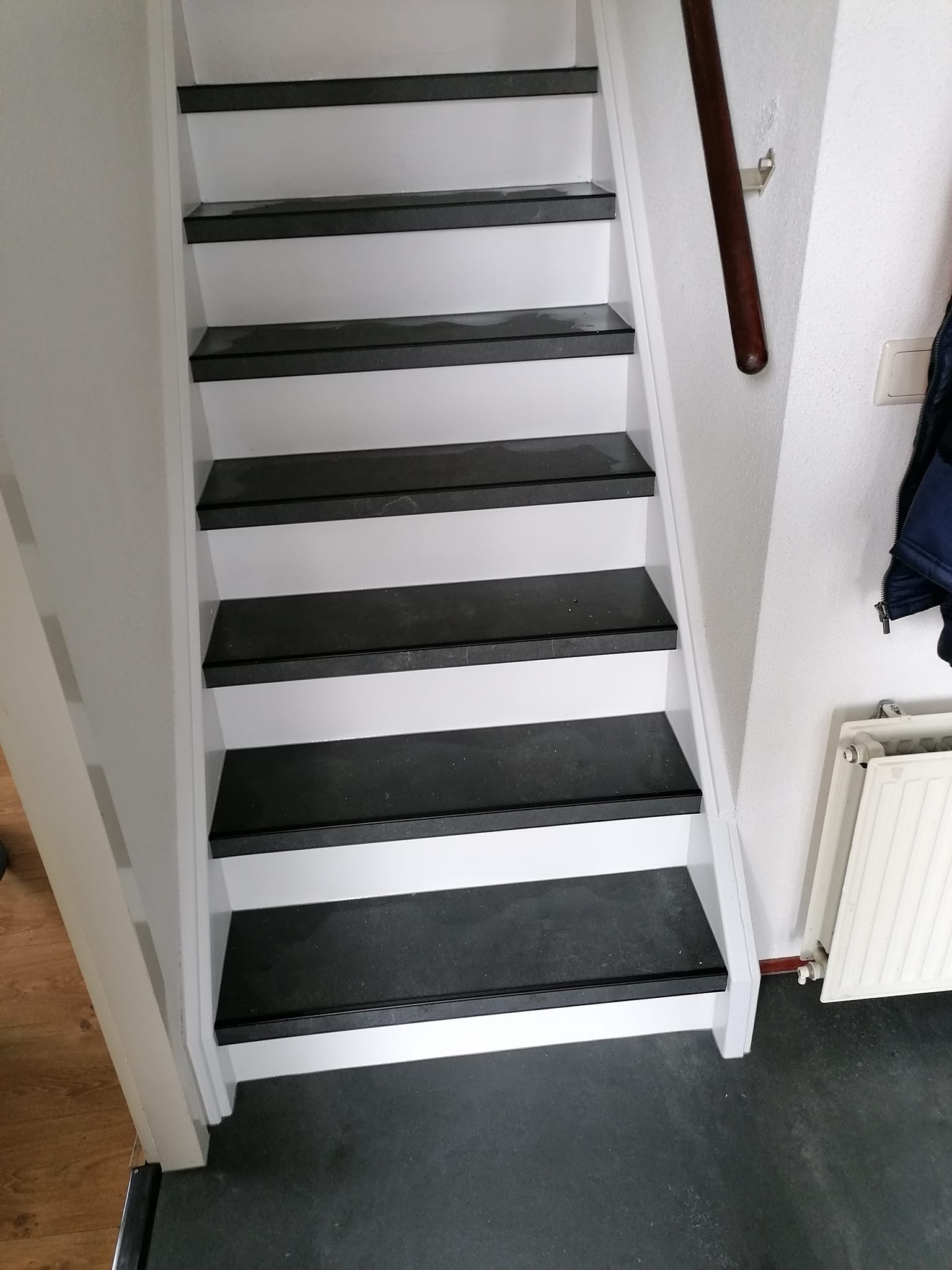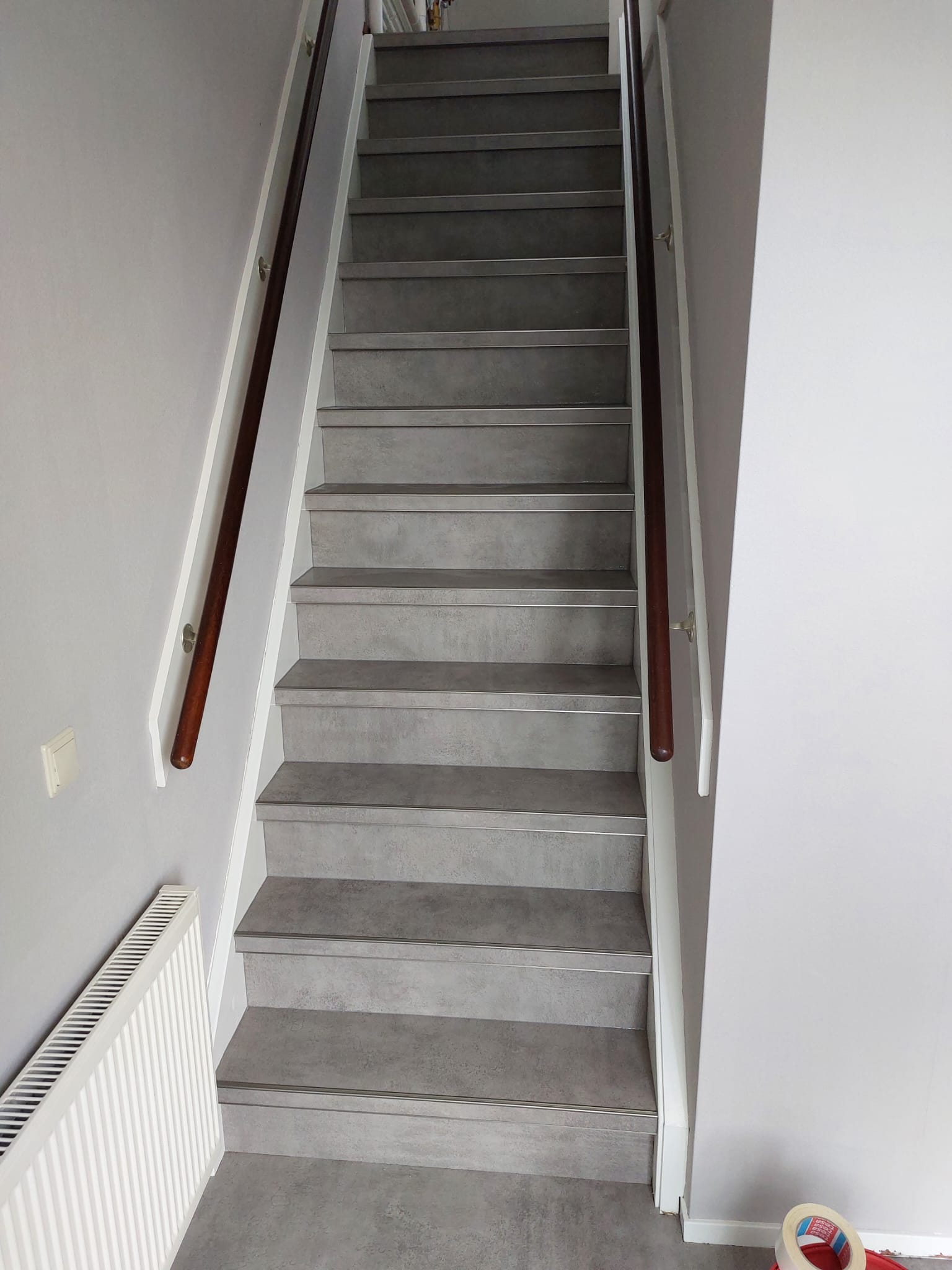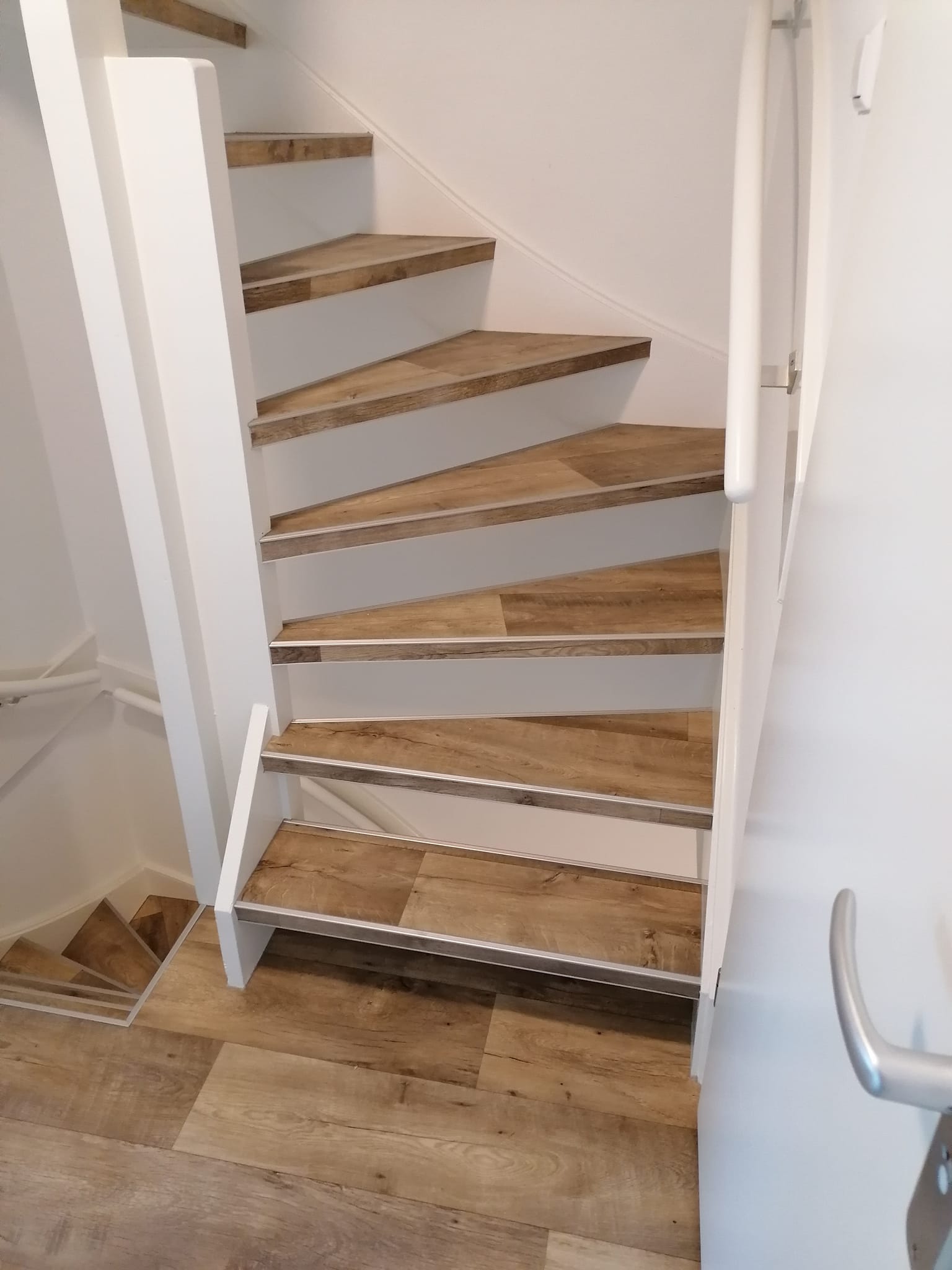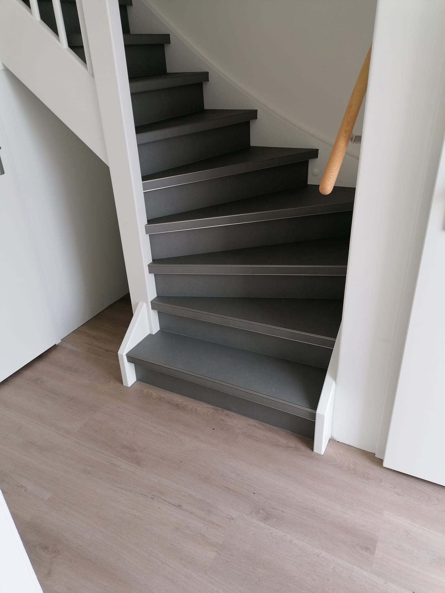Weer een paar mooie trappen opgeleverd. Trappen bekleed met vinyl en afgewerkt met aluminium trapstrippen.
